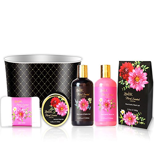 ► THE IDEAL HOLIDAY GIFT YOUR BELOVED ONES WILL THANK YOU FOR! This Relaxing Flower Spa Gift Basket includes 6 Fragrance favorites. Exotic shower gel 240 ml, Bubble Bath 240 ml, Sensual Body Lotion 130ml, bath salt 3.5 oz. and a Soft White Bath Towel