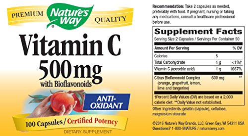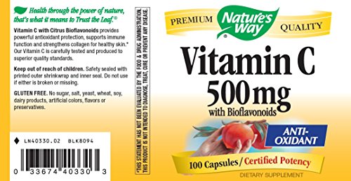 Studio : Nature's Way Publisher : Nature's Way Binding : Health and Beauty Product Description Vitamin C with Bioflavonoids provides powerful antioxidant protection, strengthens collagen and maintains white blood cell function. Dosage Take 2 capsules as needed, preferably with food. Dosage Form Does Not Contain Artificial ingredients, preservatives, yeast, milk, lactose, wheat, sugar or soy. 0