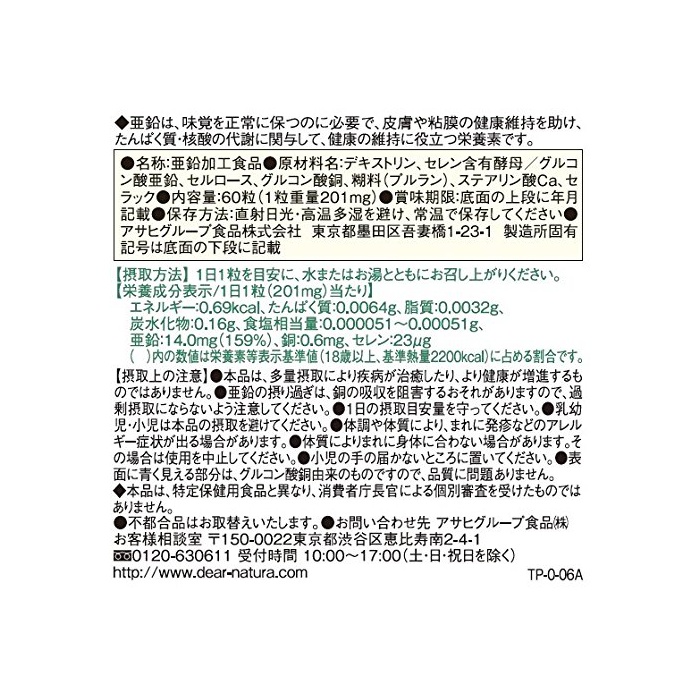 원재료 : selen 함유 효모,셀룰로오스,《구루콘》산 아연,《구루콘》산동,스테아린산Ca,전분 글리콜산Na,미립 산화 규소