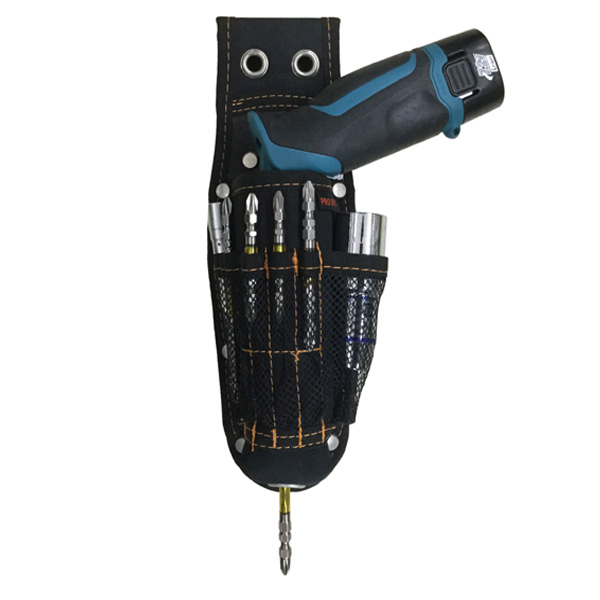 ●軽量のポリエステル製で落下防止ロープを左右どちらでも装着できる、リング付き充電ドライバーケース
