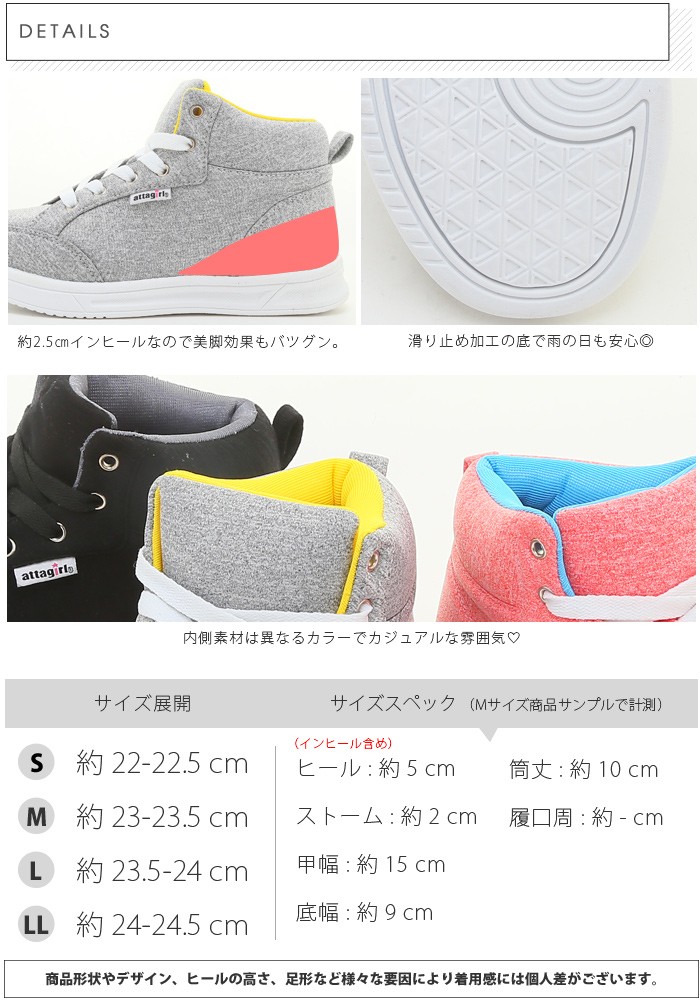 | サイズ | Sサイズ(22.0~22.5cm) Mサイズ(23.0~23.5cm) Lサイズ(23.5~24.0cm) LLサイズ(24.0~24.5cm) | | 実寸 | ヒール:約5cm ストーム:約2cm