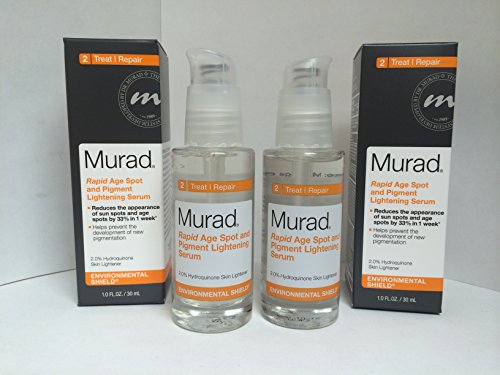 -. Binding : Misc. -. Brand : Murad -. EAN : 0767332100739 -. Feature : 2 Bottles x 1oz. each / Patented, scientifically proven formula rapidly lightens unwanted discoloration / Reduces the appearance of sun spots and age spots by 33% in 1 week* / Helps prevent the development of new pigmentation -. IsAdultProduct : 0 -. Label : Murad -. Manufacturer : Murad -. Model : 10073 -. PackageQuantity : 2 -. ProductGroup : Beauty -. ProductTypeName : BEAUTY -. Publisher : Murad -. Size : 2 x 1oz. -. Studio : Murad -. Title : 2 x 1oz. Murad Rapid Age Spot and Pigment Lightening Serum -. UPC : 767332100739