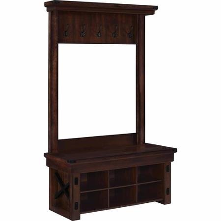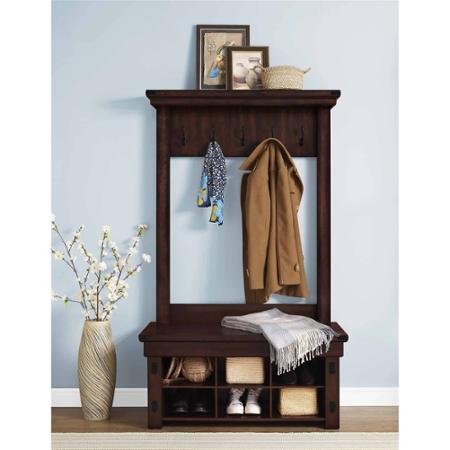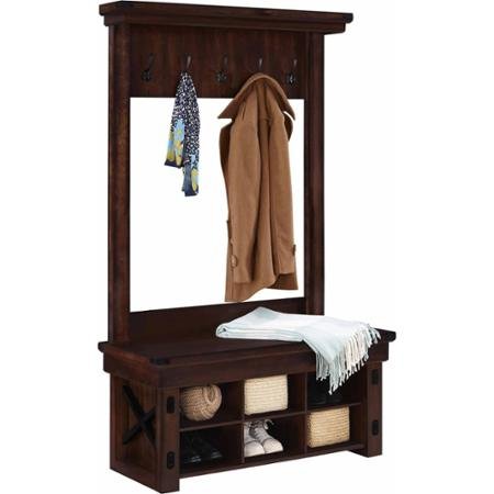 - Feature : Both beautiful and practical,Use the 5 hooks to hang hats, coats, purses or other outdoor accessories / Store shoes in the 6 cubbies,The smooth bench provides a nice seat for putting on shoes / Rustic style gives your room an instant update,Elegant dark oak finish with black metal accents give this Entryway Hall Tree with Storage Bench a sophisticated edge / Real wood veneer construction,Assembly required / Assembled dimensions: 67.17"H x 39.92"W x 18.9"D,Complete your room with additional Better Homes and Gardens Preston Park items (each sold separately)