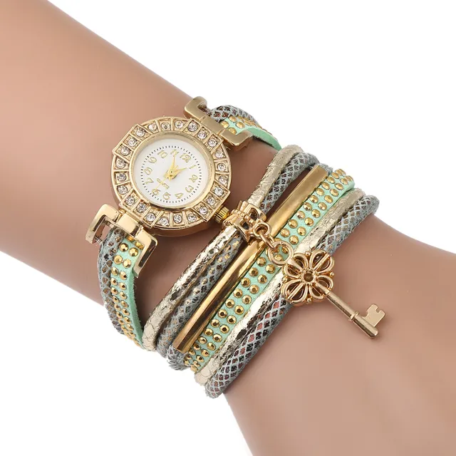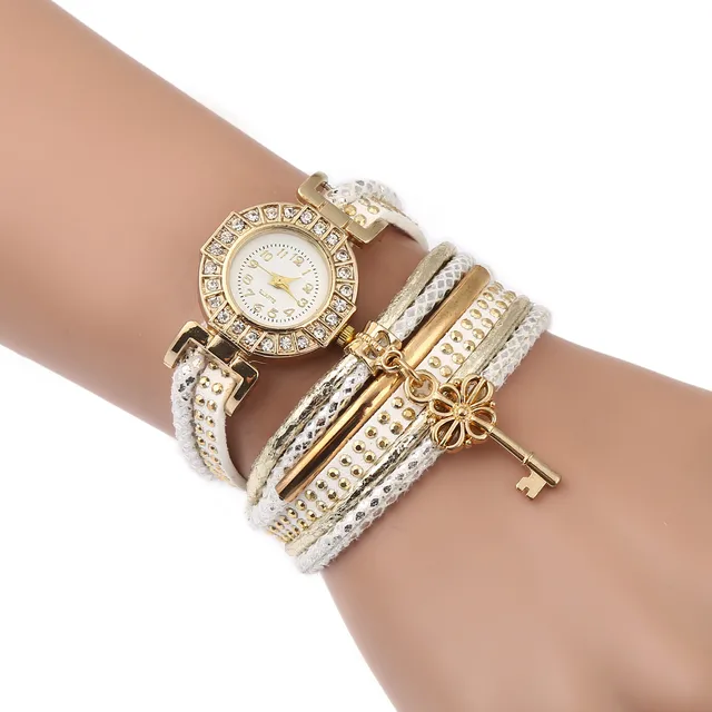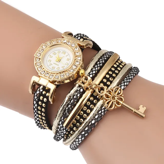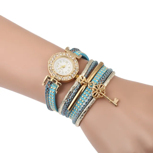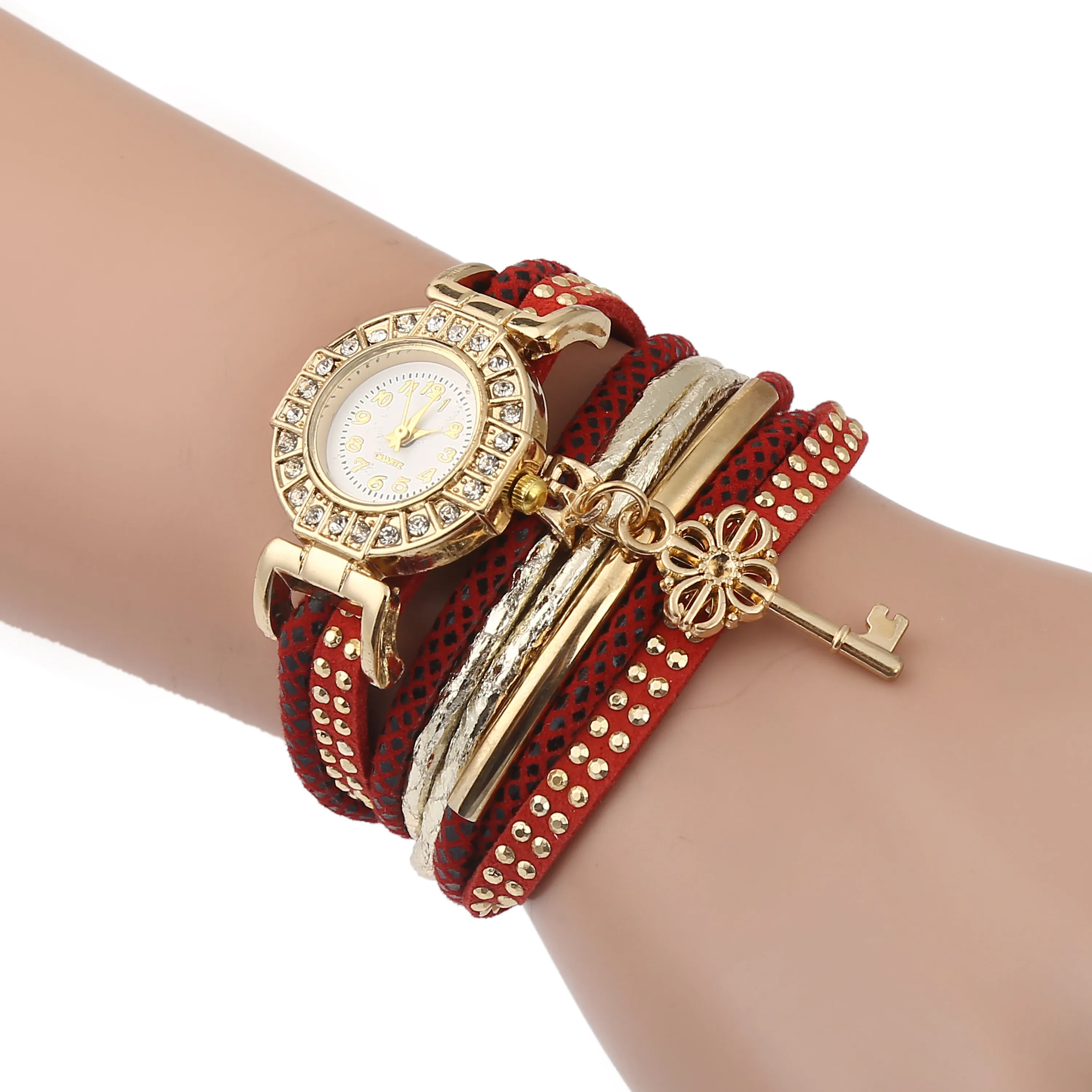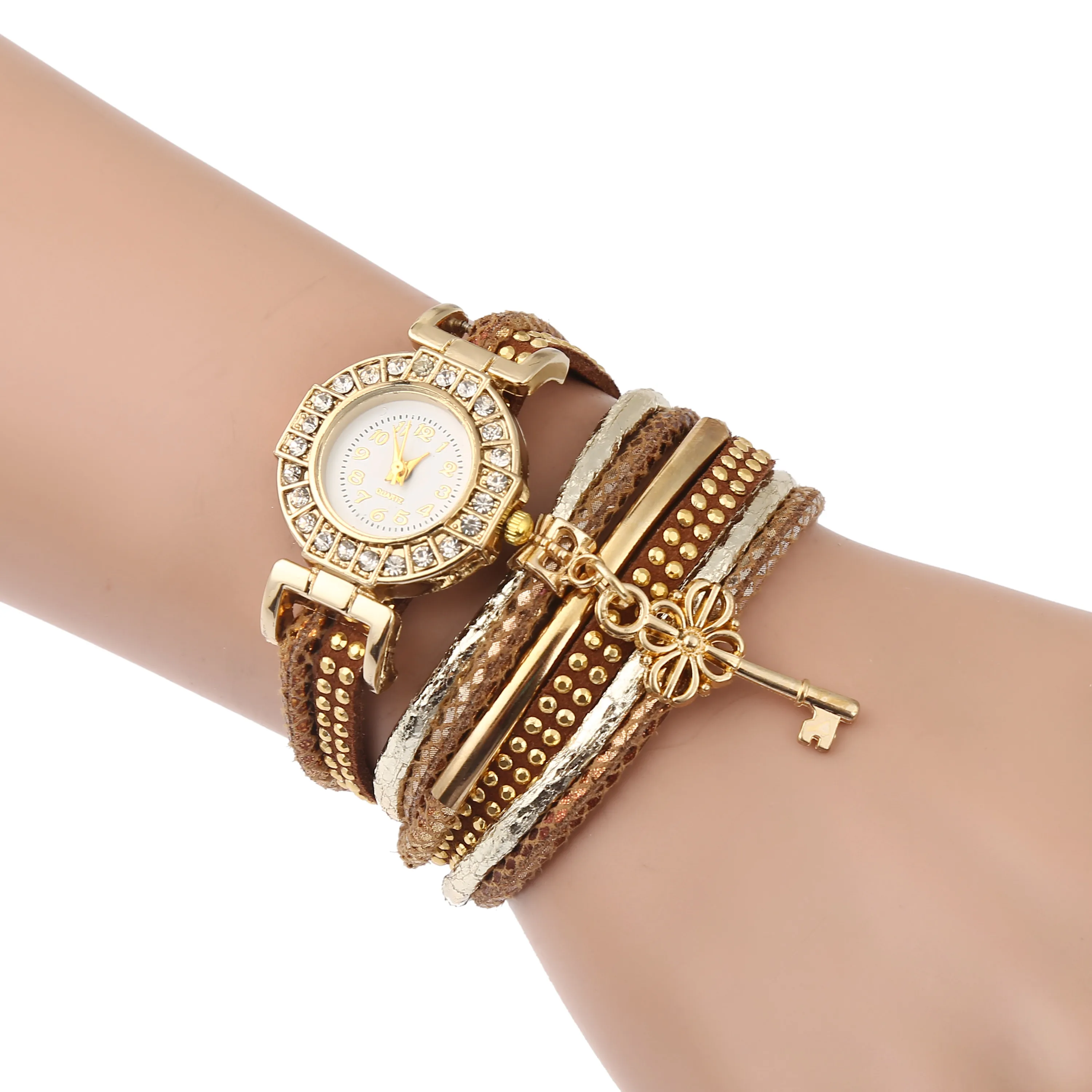 | [해외] FUNIQUE 달콤한 여성 팔찌 시계 라인 석 중공 키 펜던트 멀티 레이어 가죽 손 시계 석영 시간 Montre 팜므 |