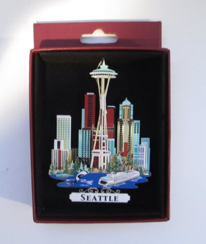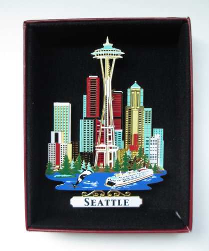 SEATTLE ORNAMENT City Skyline Waterfront Space Needle Whale Ferry Cruise Ship Evergreen Trees Genuine Solid Brass Washington State Christmas Souvenir Travel Gift