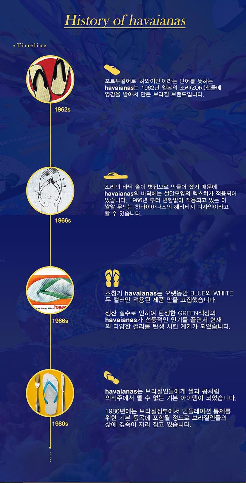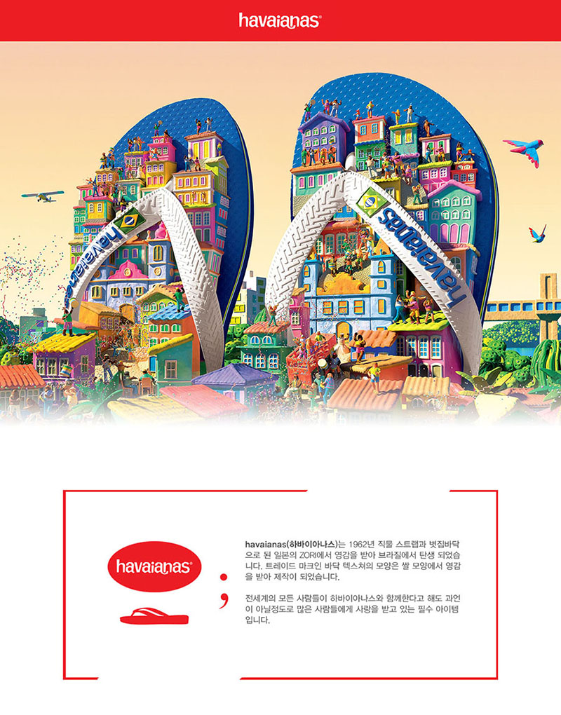 (하바이아나스)는 1962년 직물 스트랩과 볏집바닥으로 된 일본의 ZORI에서 영감을 받아 브라질에서 탄생 되었습니다. 트레이드 마크인 바닥 텍스쳐의 모양은 쌀 모양에서 영감을 받아 제작이 되었습니다.