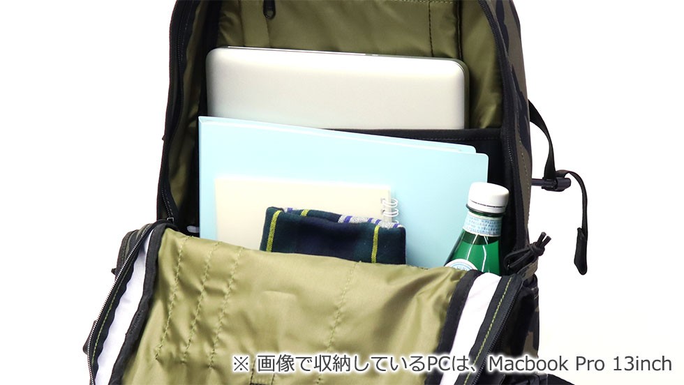 メインルームはA4サイズをゆったり収納できるサイズ感。背面側には17インチまでのPCが収納可能なポケットを装備しています。クッション材入りなので、大切なPCも保護しながら持ち歩けます。