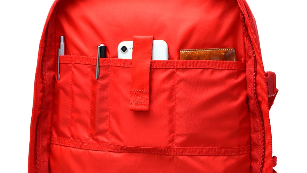 正面側にはペン類などの文房具も綺麗に収納できる大きく開くポケットを装備。細かなアイテムをここに収納しておけば、バッグ内で散らばずすぐに取り出すことができます。