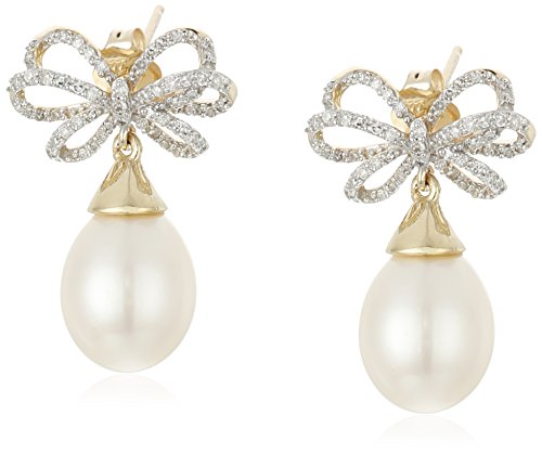 Dangle earring in 10k gold featuring diamond bow at backing and lustrous pearl drop
