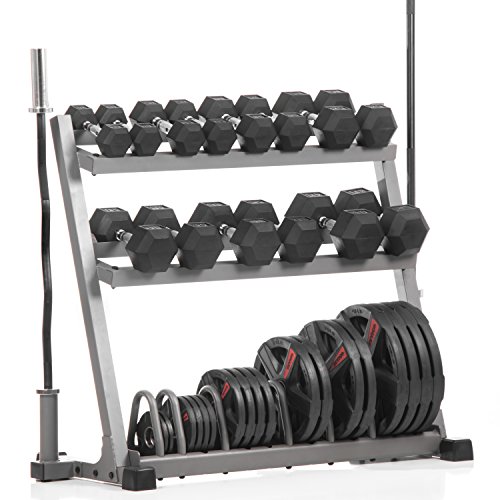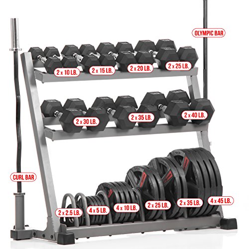 Included in this package is the XMark Dumbbell and Plate Weight Rack With Dual Vertical Bar Storage, XMark Lumberjack 7' Olympic Bar with a 700 lb. weight capacity, our 28mm Olympic EZ Curl Bar with a 400 lb. weight capacity, 350 lbs. of XMark Premium Quality, Rubber Coated Hex Dumbbells (7 pair: 10, 15, 20, 25, 30, 35 and 40 lbs.) and 365 lbs. of XMark Texas Star select rubber coated Olympic plate weights (4) 45 lb. (2) 35 lb. (2) 25 lb. (4) 10 lb. (4) 5 lb. and (2) 2.5 lb. The XMark Lumberjack 7' Olympic Bar and our 28mm Olympic EZ Curl Bar with a 400 lb. weight capacity both sport a black manganese phosphate shaft. Manganese phosphate coatings are the hardest, while providing unbeatable corrosion and abrasion protection. Protect your investment by taking a couple of minutes by wiping down your bar regularly with a light coat of WD-40 or a 3-in-1 oil. Products, as this, weighing over 150 lbs. ship with a freight carrier. We offer curbside delivery only and a signature is required. An agent with the freight carrier will contact you to schedule a delivery appointment, thus a valid phone number is required. If the freight carrier is unable to contact you at the phone number provided and a freight shipment is returned, you will be responsible for freight charges both ways, in addition to a 15% restocking fee. Freight shipments are delivered by semi-trailer trucks. It is the customer's responsibility to ensure there is enough clearance for delivery. 0 |