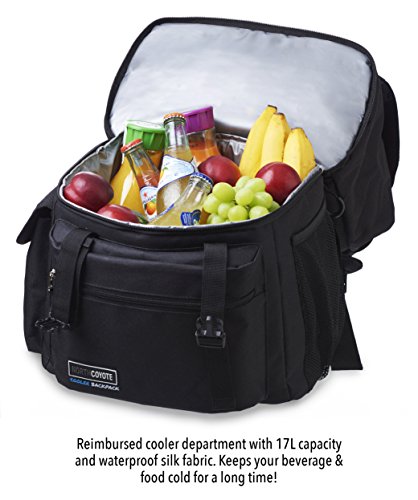 -. Feature : MADE FOR HIKING - With a collapsible cooler, a large storage compartment, chest & waist straps, NorthCoyote is the first Hiking Backpack / Daypack Cooler specially made for hiking. / ENOUGH SPACE FOR ALL YOUR BELONGINGS - One 17 liters collapsible cooler, a 25 liters storage compartment (total 42L) and 5 pockets provide enough room for food, laptop, beverages, clothes and personal effects / MULTI-PURPOSE - Made of water resistant 600D polyester, the insulated Back Pack Cooler Bag is perfect for hiking, camping, fishing, hunting, lunch, picnic, backpacking, travel and other outdoor activities. Unisex - fits both men & women / ICE PACKS BONUS WHEN YOU BUY TODAY - You will receive two FREE ice packs as bonus to use with backpacks & coolers / FRESH FOOD GUARANTEE OTHERWISE MONEY BACK- The Outdoor Hiking Backpack can keep your beverages & food cold for the whole trip. If it doesn't, just send it back within 90 days for a full refund!