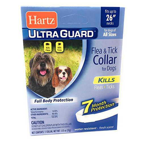 -. Binding : Misc. -. Brand : Hartz Ultra Guard Flea Collar -. EAN : 0753970617876 -. Feature : Fast-Acting Collar That Quickly and Effectively Kills Fleas and Ticks and Lasts for 7 Months. Each Package Contains 1 Hartz Ultraguard Flea Tick Dog Collar. / Hartz Ultraguard Flea Tick Dog Collar Easily Adjustable Fits Necks Up to 26 Inches. / Water Resistant With A Fresh Clean Scent. Made in USA. Breed Size: Large Giant. Lifestage: Adult All Stages. / Safe Easy and Effective Treatment for Dogs and Puppies 6 Weeks of Age and Older. Not for Use on Cats or Kittens. / Hartz Ultraguard Flea Tick Dog Collar Can Be Worn with A Regular Collar. -. Label : Hartz Ultra Guard -. LegalDisclaimer : Please read and comply with all labels and warnings. If you're not sure about the exact wording of your disclaimer, consult your manufacturer or seek legal aid. Not Intended for Human Consumption. Supervision of your Pet is Advised. -. Manufacturer : Hartz Ultra Guard -. MPN : Hartz -. NumberOfItems : 1 -. PackageQuantity : 1 -. PartNumber : Hartz -. ProductGroup : Pet Products -. ProductTypeName : PET_SUPPLIES -. Publisher : Hartz Ultra Guard -. Size : Large -. Studio : Hartz Ultra Guard -. Title : Flea Collar for Large Dogs Water Resistant Tick Repellent 7 Months Protection -. UPC : 753970617876