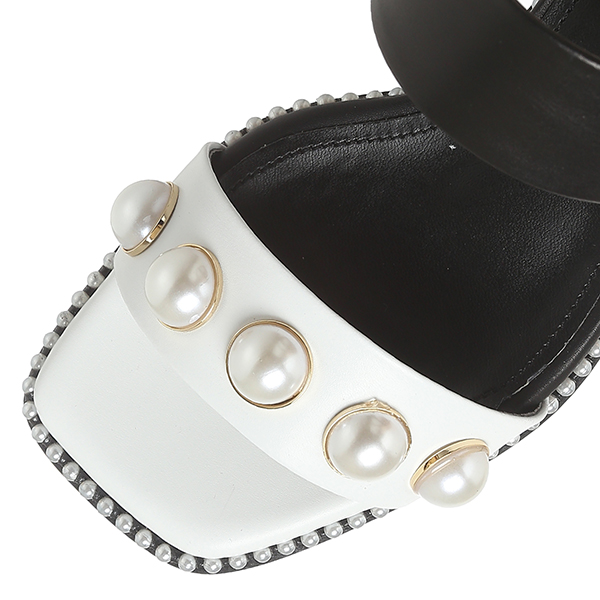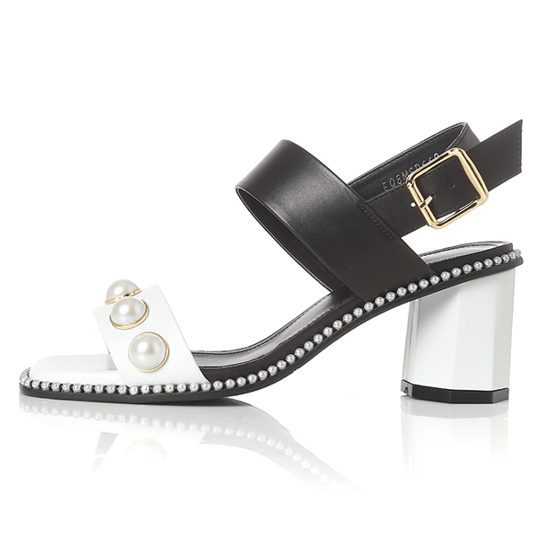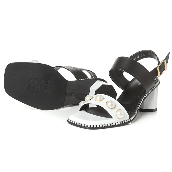 드한 스퀘어라인의 중창과 진주웰트가 포인트인 샌들로 기하학적인 다각형의 굽과 과감한 칼라블럭킹 어퍼는 다양한 스타일에 포인트아이템으로 활용도가 높음