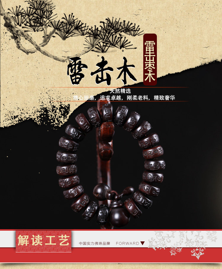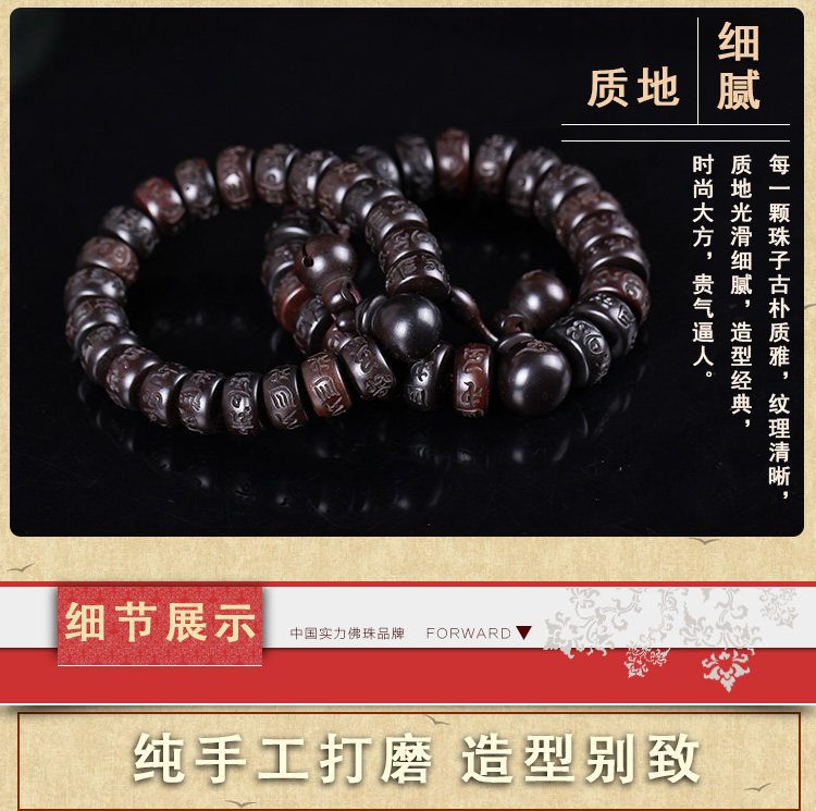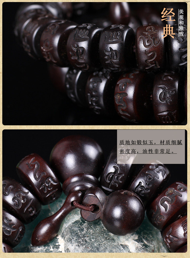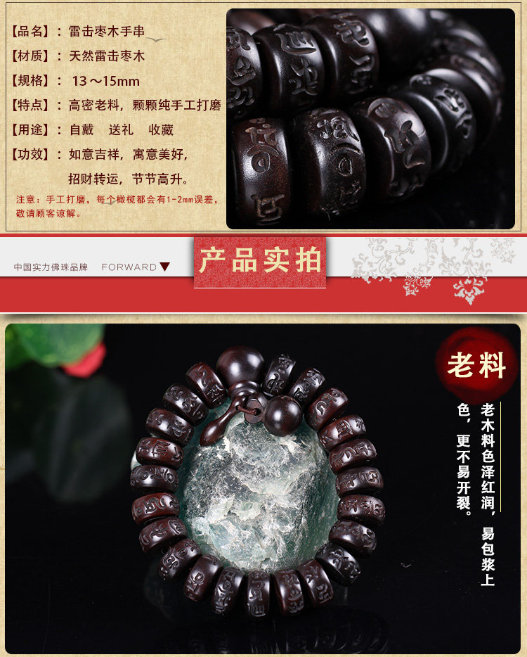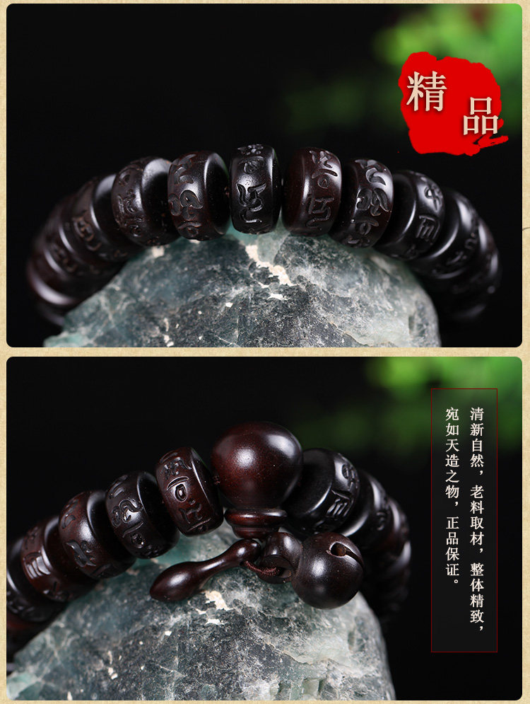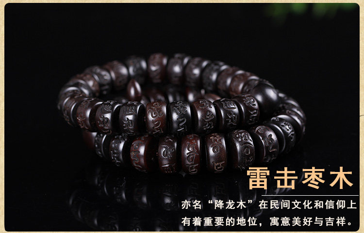 天然雷击枣木桶珠雕刻六字真言佛珠手链木鱼吊坠男女辟邪平安手饰