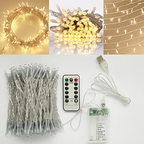 [Double Power Modes] Warm White LED Indoor battery operated String Light with Remote and Timer on 69ft Clear String (8 Modes, Dimmable, Auto Timer, 200 LEDs)