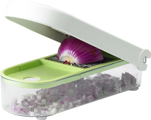 -. Feature : 2-cup onion chopper by Progressive International / Crafted of reinforced plastic with a stainless steel blade / Dices onions in one swift motion by closing lid / Measurements are clearly marked on sides / Comes with a lid cleaning tool
