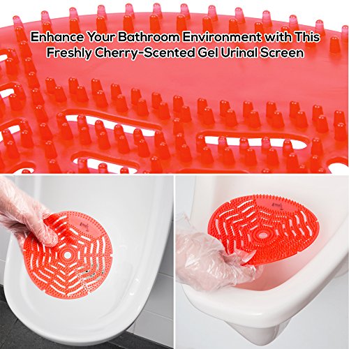 Industrial Grade Urinal Screen and Deodorizer, 10 pack, Anti-Splash & Anti-Bacterial Design – Fits Most Top Urinal Brands at Restaurants, Offices, Schools and includes 10 Poly Gloves (Cherry Scent).