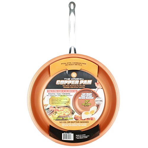 Original Copper Pan non-stick ceramic cookware for today's health conscious consumer. Original Copper Pan is made without the use of synthetic chemicals PFOA and PTFE yet even the stickiest foods slide right off with ease. Fry eggs, flambe desserts, broil savory flaky fish and even caramelize sugar without the need to butter, fat or oil. Versatile enough to be used on the stovetop or oven while withstanding up to 500 degree Fahrenheit temperatures, Original Copper Pan is the versatile non-stick pan for all your cooking needs. Available in both 10" or 12". Dishwasher-safe and scratch-resistant surface will provide you with years of dependable service.Feature
