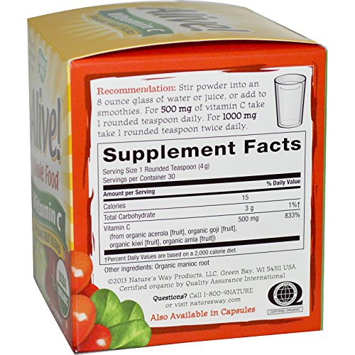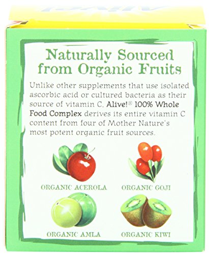 Unlike other dietary supplements that use isolated ascorbic acid or cultured bacteria as their sources of vitamin C, Alive! Fruit Source Vitamin C derives its entire vitamin C content from four of Mother Nature's most potent organic fruit sources: Organic Acerola, Organic Kiwi, Organic Amla, and Organic Lycium (Goji).