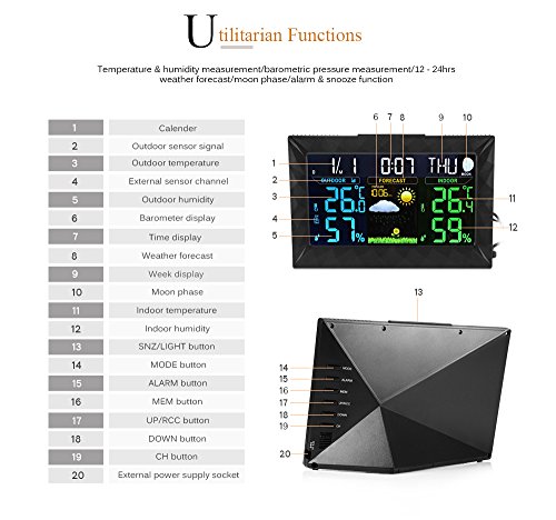 - 【ALL-IN-ONE FUNCTIONS】Numerous display information The screen provides you time, date, weekday, indoor and outdoor temperature and humidity, moon phase, pressure, and forecast weather, helping you prepare in advance.