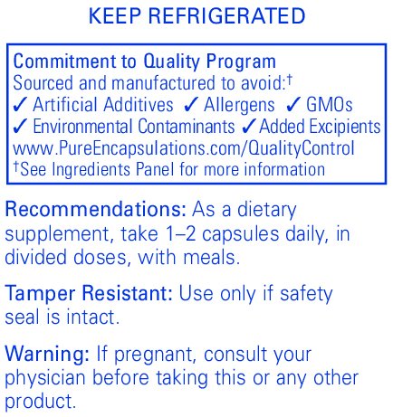 FREE FROM: Pure Encapsulations products are free from wheat, gluten, egg, peanuts, magnesium stearate, hydrogenated fat, artificial sweeteners and colors, and other unnecessary excipients. Any product containing ingredients derived from allergens, such as soy, dairy or shellfish is clearly labeled. * These statements have not been evaluated by the Food and Drug Administration. This product is not intended to diagnose, treat, cure, or prevent any disease.