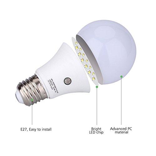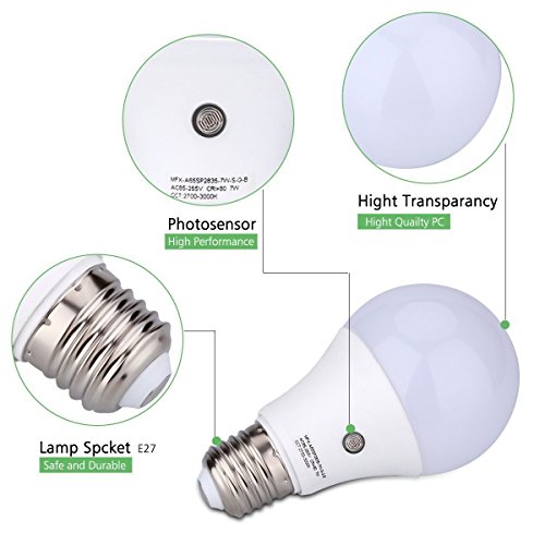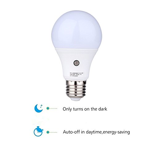 -. Binding : Electronics -. Brand : cjc -. EAN : 6920836394262 -. Feature : Light appearance: 6000K (cool white). Lumens: 630. Uses 80% less energy compared to a standard incandescent light bulb. Built-in sensor that detects daylight and turns the bulb on in the evening and off in the mornings / INCREDIBLE LIFETIME - With an astonishing life rating of 50,000 hours, replacing light bulbs is now a thing of the past. / EFFORTLESS INSTALL - Standard shape with medium screw base (E27/E26). Installs into all medium screw base fixtures directly. Simply screw the bulb into the socket and flip the switch! / TIMELESS VERSATILITY - Automation in the home can make every day task easier. When coming home at night to an dark house it can be more pleasant if a light has automatically been turned on. For Porch Hallway Patio Garage Backyard / HASSLE-FREE WARRANTY - 3-year unlimited warranty means we've got you covered! Contact us for an easy and fast replacement. -. Label : cjc -. Manufacturer : cjc -. MPN : AC1110075*6 -. PackageQuantity : 1 -. PartNumber : AC1110075*6 -. ProductGroup : Photography -. ProductTypeName : SURVEILANCE_SYSTEMS -. Publisher : cjc -. Studio : cjc -. Title : 6-Pack E27 7-Watt 630Lumens LED Dusk-to-Dawn Sensor Light Bulbs Built-in Photosensor Detection Auto Switch Energy Saver Light Indoor/Outdoor Lighting Lamp for Porch Hallway Patio Garage (6000K)