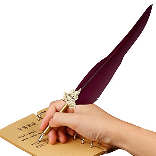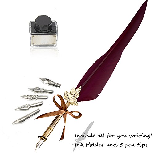 Feather Pen Glodeals Feather Quill Pen Antique Dip Feather Pen Set (Wine Red)