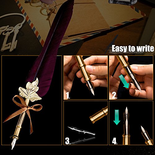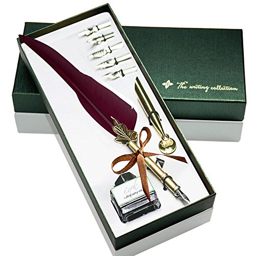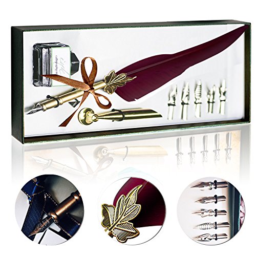 - The quill pen set includes 5 extra calligraphy nibs, 1 feather pen, 1 ink bottle and 1 gift box. perfect feather quill pen brings you a different life experience