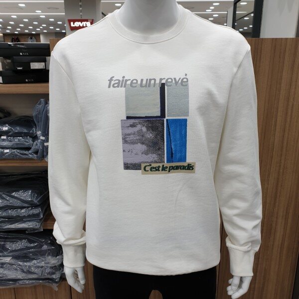NIX 2019년 봄 신상 입니다. C/P 삼단쭈리 베이직핏. 프랑스 느낌의 모티브와 프랑스어를 활용한 디자인의 맨투맨 입니다. (의미: 희망을품다, 낙원을 꿈꾸다) 마네킹 100size 착용