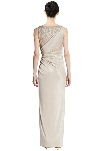 A elegant evening silhouette of shimmering lace and flatteringly ruched satin. Bateau neckline. Sleeveless. Sequined lace bodice. Padded cups. Front slit. Ruched side. Concealed back zip with hook-and-eye closure.