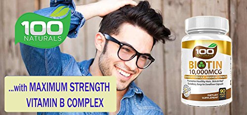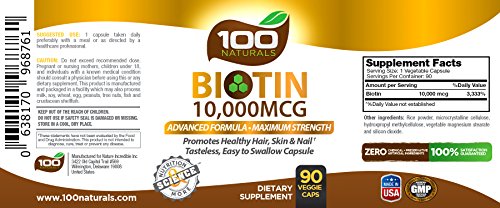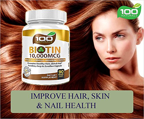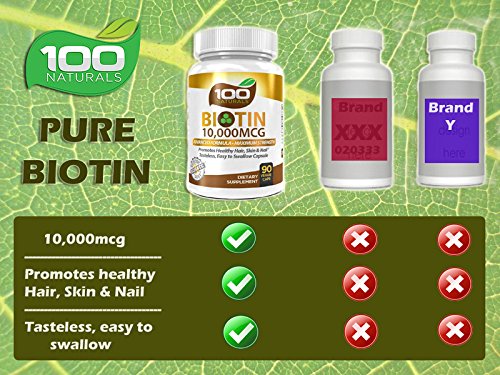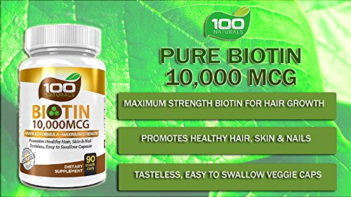- Feature : ★ Maximum Strength Biotin For Hair Growth: Each capsule contains 10,000 mcg biotin. / ★Pure Biotin: 100 NATURALS Biotin has a net amount of 10,000 mcg PURE biotin in each capsule. There are other 10,000 mcg Biotin products on the market that have only 1% biotin, i.e, 10 mcg biotin per capsule/tablet. / ★Easy to Take: Unlike biotin tablets that are associated with difficult swallowing, bad smell, and poor absorption, this vegetable capsules based Biotin is odorless, easy to take and absorb. Taking one capsule a day is all you need to get the adequate biotin, the most important vitamin for healthy hair, skin, and nail. / ★Best Quality: Our FDA-registered facility is NSF and GMP certified, and all of our products are manufactured in the USA. / ✔ Backed by 100 NATURALS' Unprecedented Five 100% Guarantees✔ : 100% Natural | 100% Drug Free | 100% Satisfaction Guarantee | 100% Full Refund If Not 100% Satisfied for ANY Reason in 100 Days | 100% Made in USA.