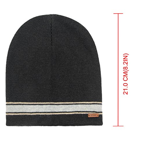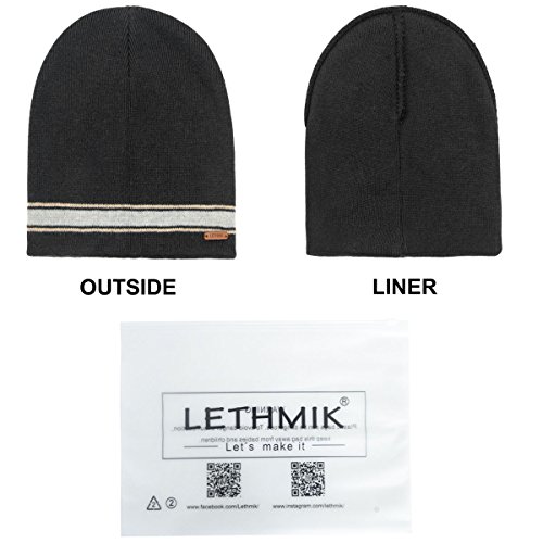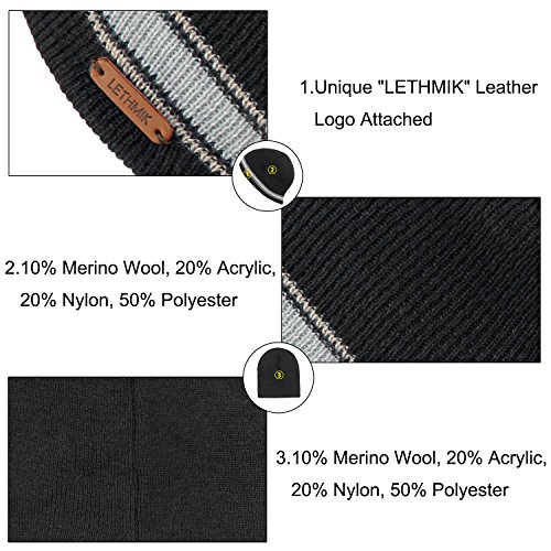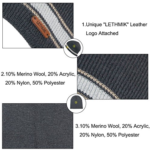 Binding : Apparel Product Description LETHMIK hats collection. LETHMIK Merino Wool Daily Beanie,Unisex Warm Soft Winter Hat Unique Knit Skull Cap; One Size Fits MOST, Skully and Cosy Fit. Comfortable and high quality hat material, provides Comfort, Warmth and excellent elasticity, Stretches to fit most sizes, You can easily get a custom fit according to your head size. This hat is made of High quality Australian Merino wool, super Soft and Comfortable. Plain and Solid color Knitted workmanship, Build a simple but stylish style, Chic "LETHMIK" leather logo decoration, increases personality and identification. A wonderful hat for wearing while skiing, snowboarding, skating, sledding, snowshoeing, camping, hiking or any outdoor sports and activities. We make this hat the perfect balance between soft, warm, lightweight and stylish. Pair off with your favorite Outfit. Product Care Instructions:Do not wash by hot water; Do not chlorine bleaching; Hang dry in shade; Do not iron; Hand Wash or Spot clean recommended! Please Try Not to Machine Wash or Brush Wash (In order to avoid Pilling). Please check genuine authentic item tag to avoid counterfeit products.Counterfeiters are capable of copying the appearance of lethmik items but there're no "LETHMIK" tags and our packing. Our customer service Email address is: customerservice@lethmik.com ; You can feel free to contact us if you would have any questions, and we will try our best to bring you with the best services. 0