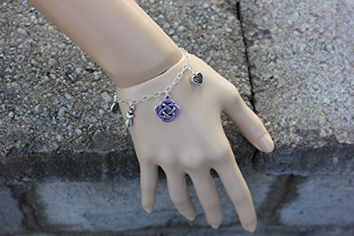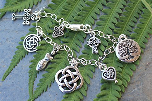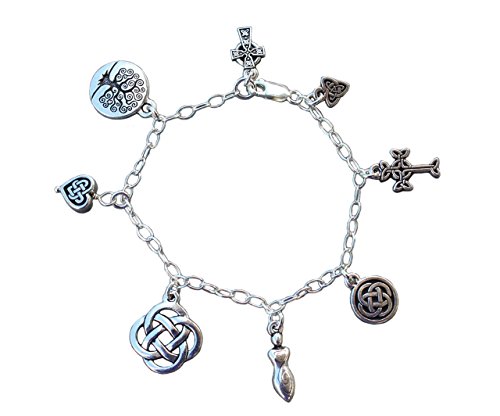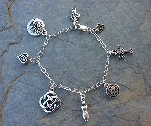 -. Feature : Silver plated pewter charms, made in the USA. Charms range from 3/8" to 3/4" tall. / Sterling silver bracelet chain and lobster clasp. / Charms include 2 four cornered Celtic knots, a tree of life, 2 Celtic crosses, triquetra, heart & spiral goddess / Available in XS (6.5 inches), S (7 inches), M (7.5 inches), L (8 inches) and XL (8.5 inches). PICK SIZE FROM LENGTH PULL DOWN MENU. / Handmade in the USA by Night Owl Jewelry
