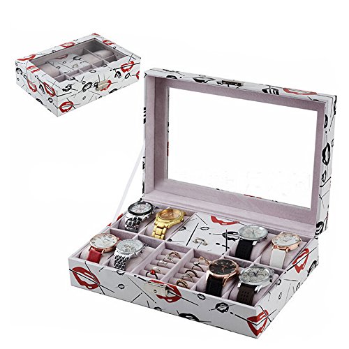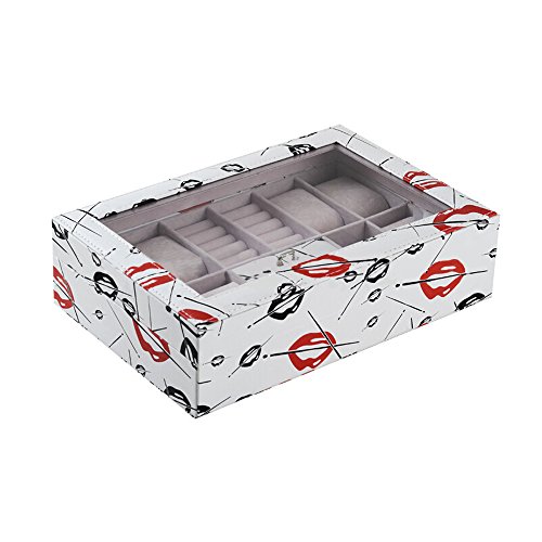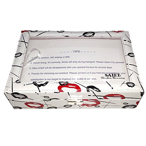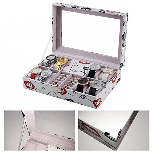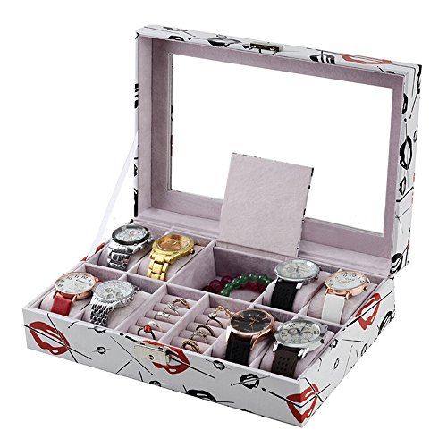 -. Feature : • Material: Surface PU Leather/Velvet Lining/Glass Top/Hardware Lock &Key / • Color: White Special Pattern Design / • Size: 30cm*20.2cm*8cm/11.81" L*7.95" W*3.15" H, Weight: 1155g/2.55Lbs / • Display: 8 grids for watch + 10 grids for ring + 1 large box with cover for bracelets and necklaces / • Well packaged. Enough stock in US warehouse, free shipping, duty free.