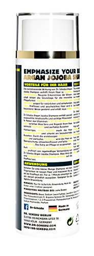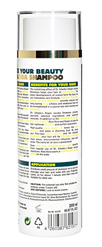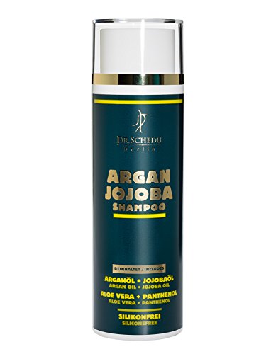 The revitalizing effect of Dr. Schedu's Argan Jojoba Shampoo helps your hair to look healthier. The latest developments of science form the basis for our innovative care formula: Argan oil, Aloe Vera Gel, Jojoba oil and Panthenol provide natural and long lasting glow. Lifeless and weakened hair will be strengthened in a special way and receives new resilience. Dr. Schedu's Argan Jojoba Shampoo contains specially selected ingredients and essential minerals. In addition to the vitamins A, B1, B2, B6, B12, C, D, E and F Aloe Vera and Argan oil give the hair optimum moisture and perfect appearance. High-quality pure Argan oil leaves hair soft, smooth, and gives a charming look. By using our first-class plant extracts and the valuable Panthenol your hair will be effectively protected from stress, environmental influences, and split ends. The extra bit of care is guaranteed. Even dry and dandruff-prone scalp benefits from regular use of Dr. Schedu's Argan Jojoba shampoo. Aloe Vera exerts a soothing and cooling effect on the scalp. Application: Distribute small amount of shampoo on to wet hair, massage your hair and scalp with your fi ngertips. Leave on for about 1 minute and then rinse well. Suitable for daily use.Feature