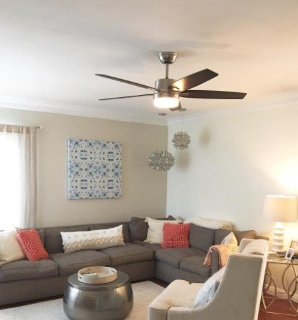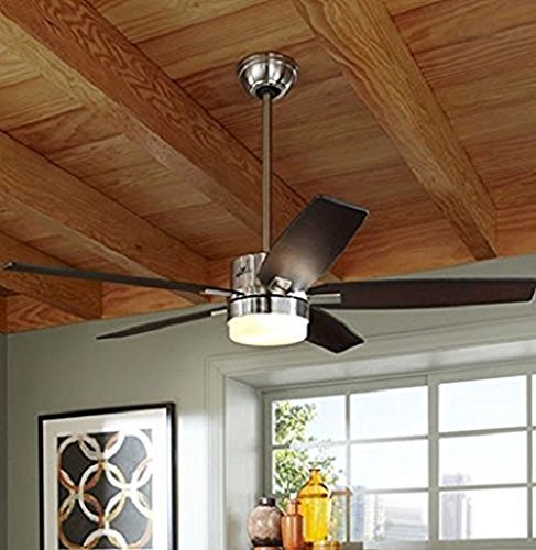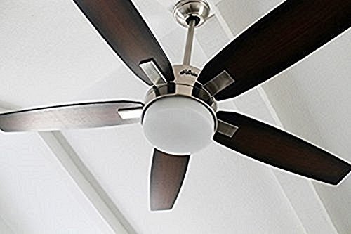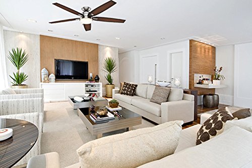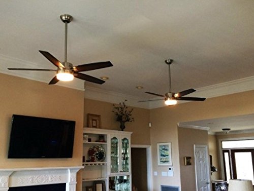 Includes set of 5 blades. Remote control. 6 in. Downrod and hardware kit. 54 in. Blade span. Flush mount option. Airflow: 6434 cfm. Electricity use: 86 watts. 13 degree blade pitch. Can be used with or without light kit. Whisperwind motor. Warranty: limited lifetime. Brushed nickel finish. Blades in dark wood finish. Assembled height: 12.62 in. Assembly instructions. Leave the past in the past with this ultra-sleek, contemporary design.Feature