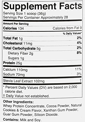 -. Feature : Whey protein has a fast absorption rate , which means not only does it help build muscle, but it also helps repair muscle immediately after a workout / Provides all nine essential amino acids necessary for our bodies / Can be used as a meal replacement / Provides 25 grams of protein and 5.6grams of BCAA's per serving / Delicious tasting cookies and Cream flavor that mixes with your favorite beverage and is naturally sweetened with Stevia