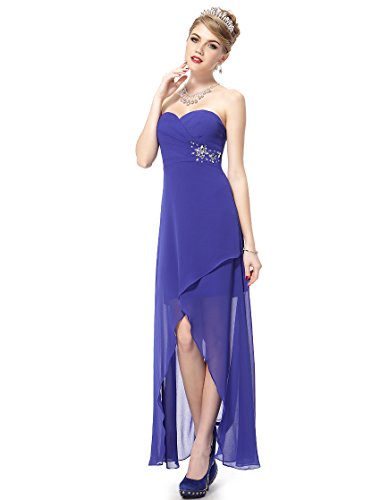 Strapless hi-lo party dress. Padded enough for "no bra" option. Stunning rhinestones decorate the waist area. Asymmetric hi-lo bottom design. Concealed side zipper Lining, no stretch