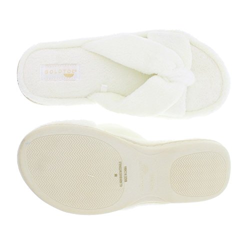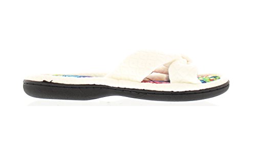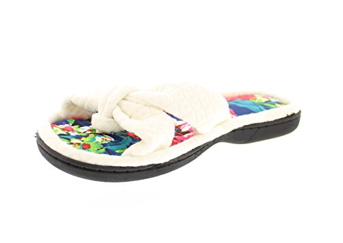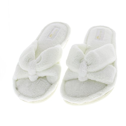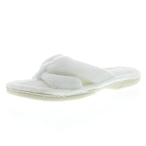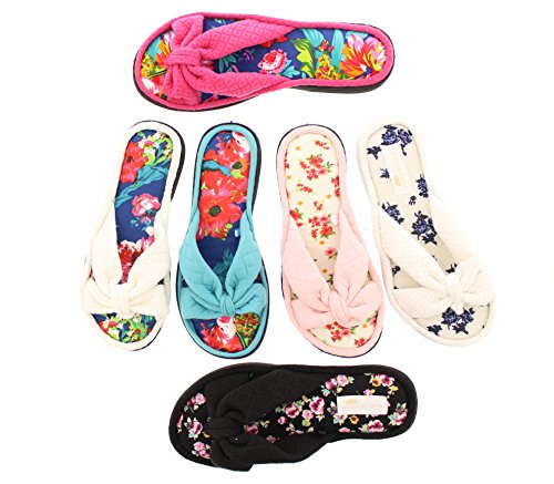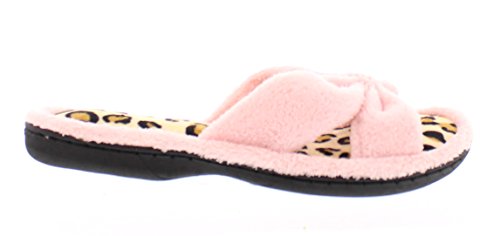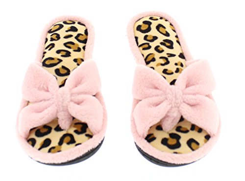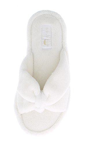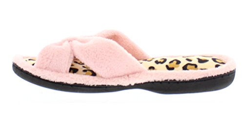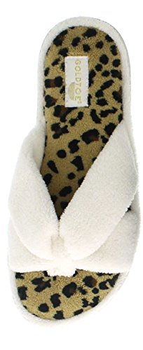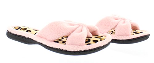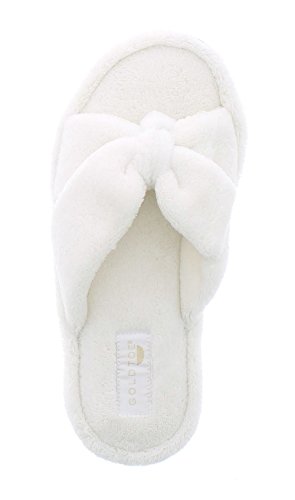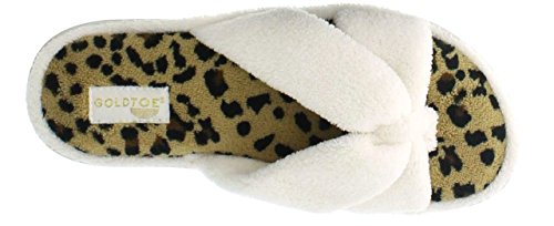 Binding : Apparel Product Description The classy GOLDTOE® Darcy and Marcy slippers offer cozy everyday comfort wrapped up in a sweet strappy bow. The thong straps, toe separator and open back provide a casual slip on scuff slipper style for easy wear. Made of plush fleece to wick away water and moisture, these ultra soft slippers will keep your feet cool and comfortable - they are the perfect luxury bath slippers or spa slippers. The cushioned memory foam footbed molds to fit the shape of your feet for extra long lasting comfort so that you can also pack these flip-flop style slippers along as travel slippers for ultimate relaxation on the plane, by the pool, or in the hotel room. The durable anti-slip rubber outsoles on these flat slipper shoes provide both the flexibility for indoor use and also for outdoor use so that you can step out in chic style as you're checking the mailbox, taking out the trash, walking the dog, or pampering your toes with a pedicure at the nail salon. Designed to fit your personality and stylishly coordinate with your athleisure loungewear, pajamas, nightgown, and bathrobe, choose from the Darcy for fashionable solid classic colors or the Marcy for a fun leopard print to the basic black slipper. The easy slip-on style, breathable moisture wicking soft terry fleece, feminine bow detail upper, padded memory foam insole and sturdy anti-skid hard rubber outsole makes this cute and comfortable slipper a great choice to wear as hospital slippers or maternity slippers. Fit Guide - These shoes are available in whole sizes only. If you are a half size, we recommend purchasing a shoe size up. For example, if you normally wear a size 6 1/2 we recommend ordering a size 7.
