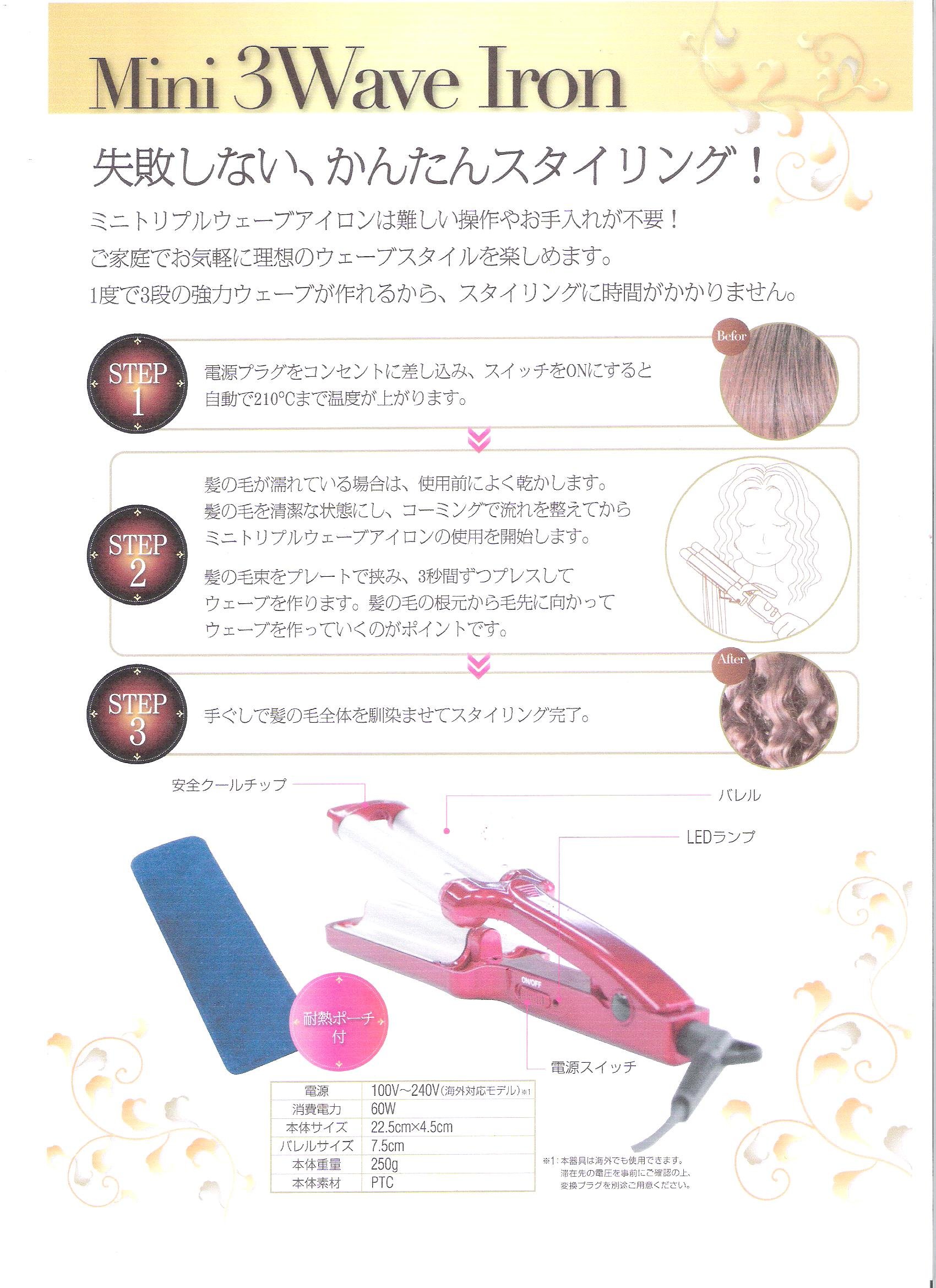 The Mini Triple Wave Iron is a mini size perming iron that can be carried easily, without bulking it even in a bag.