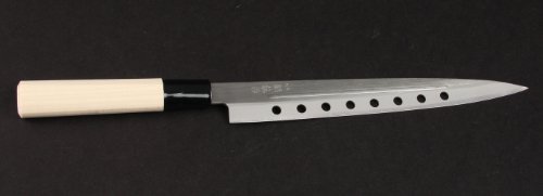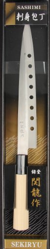 Japanese yanagiba sashimi knife for prepare sashimi. Molybdenum rust-resistant steel blade razor sharp edge blade length: 8 in overall length: 13 in wooden handle offers maximum comfort and control holes creates air gap to prevent food sticking to the blade plastic bolster easy to sharpen made in japan by sekiryu how to sharpen: >Sharpening on a whetstone >dampen whetstone. >Sharpen on whetstone on flat surfaces only Usage and care: Wash knife with dishwashing liquid before use. Always dry blade thoroughly after washing. Do not use scrub brushes or abrasive cleansers types of knives: Santorum -- all purpose: For vegetable, fish, meat nakiri -- chopping: For vegetable Guyton -- multipurpose kitchen knife. For cutting vegetable, fish, or meat debar -- hard foods: Fish bones, meats sashimi -- slicing: Slicing raw fish.