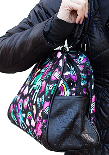 -. Feature : Features flying unicorn ponies, rainbows, lightening bolts and tattooed hearts with rainbow banners on front and back / Quilted side panels with embossed Liquorbrand logo / Fully lined in Liquorbrand logo P.R.Inted fabric. Interior zip pocket. Full zipper closure / Measures 14 inches wide, 10 inches high 4.5 inches wide / Vegan-friendly