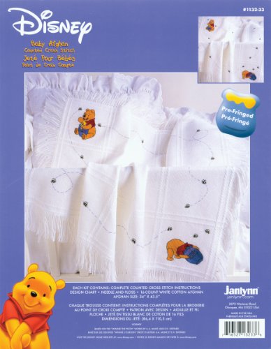 Endearing, irresistible silly old bear, loved by his Honey Bee friends. Easy to stitch Counted Cross Stitch design is from Disney. Based on the "Winnie The Pooh" works by A.A. Milne and E.H. Shepard. Looks like a heartwarming adventure in a 'hunny' pot. Afghan fabric is luxuriously soft and gentle against baby's skin. A free Disney Gift card and envelope included for gift giving purposes. Floss is carded for easier identification of colors Each kit contains 16-count White Cotton Afghan fabric, 6-Strand cotton floss, needle, instructions in English, French and Spanish with a full color chart.Feature