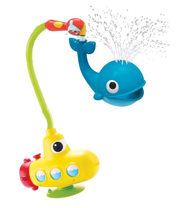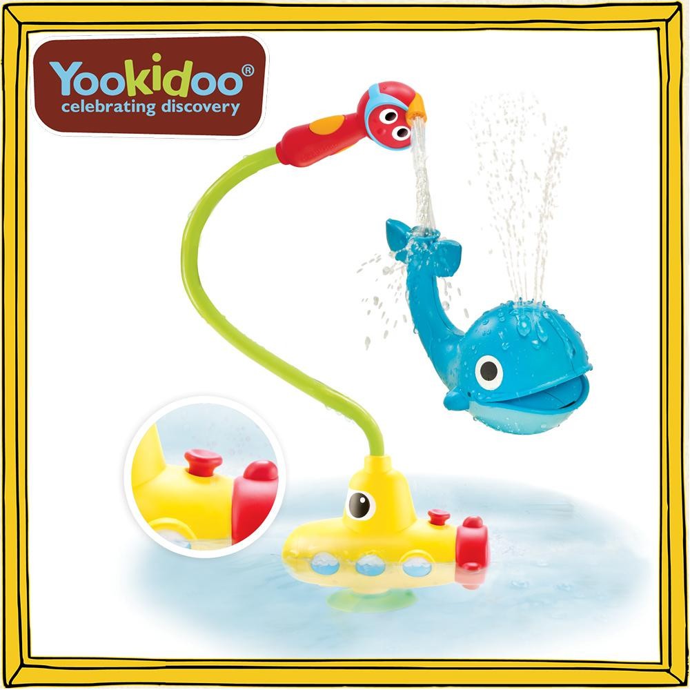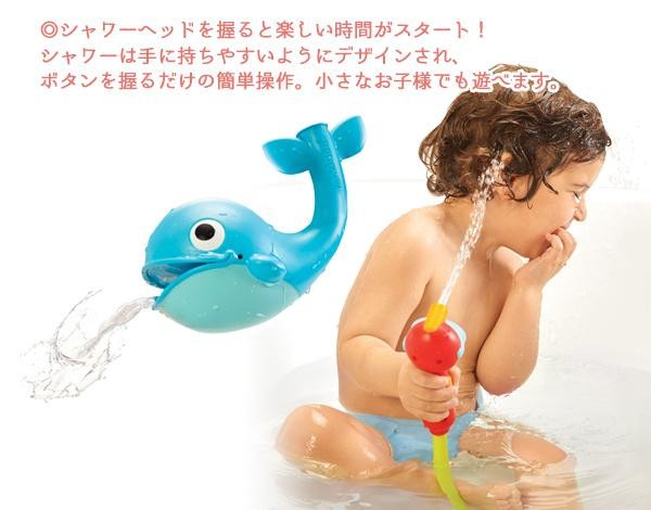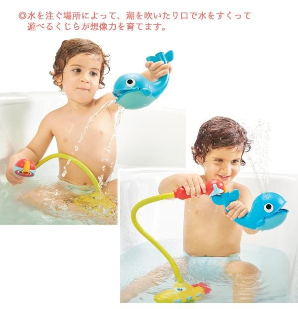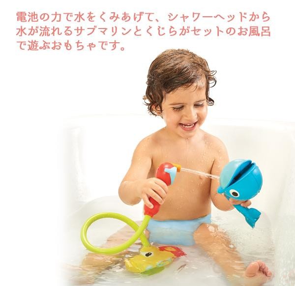 | 電池の力で水をくみあげて、シャワーヘッドから流れる水で遊ぶサブマリンとくじらがセットのお風呂のおもちゃです。水を注ぐ場所によって、潮を吹いたり口で水をすくって遊べるくじらが想像力を育てます♪ |
