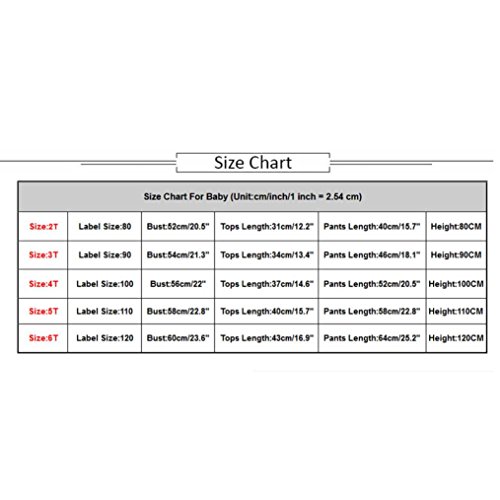 ★ NOTE: Attention plz: If your kid is chubby, we recomend choosing a larger size, Please compare the detail sizes with yours before you buy!Thanks. ★ Size Details (1 "= 2.54cm): Size:2T Label Size:80 Bust:52cm/20.5" Tops Length:31cm/12.2" Pants Length:40cm/15.7" Height:80CM Size:3T Label Size:90 Bust:54cm/21.3" Tops Length:34cm/13.4" Pants Length:46cm/18.1" Height:90CM Size:4T Label Size:100 Bust:56cm/22" Tops Length:37cm/14.6" Pants Length:52cm/20.5" Height:100CM Size:5T Label Size:110 Bust:58cm/22.8" Tops Length:40cm/15.7" Pants Length:58cm/22.8" Height:110CM Size:6T Label Size:120 Bust:60cm/23.6" Tops Length:43cm/16.9" Pants Length:64cm/25.2" Height:120CM ★★Guaranteer: ★If it is the quality question,we will resend or refund to you;If you receive damaged or wrong items,please contact me and attach some pictures about your product and packages to me,i will confirm it for you,if it really has some wrong,I will exchange a new correct item to you. ★If you are satisfied with our product or service,please leave your positive feedback! ----YANG YI ,Thanks so much. ★Please check the measurement chart carefully before you buy the item. Please note that slight color difference should be acceptable due to the light and screen. Please use cold water washing first time, and hand wash, to avoiding fades. 0