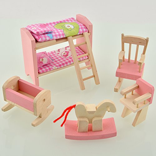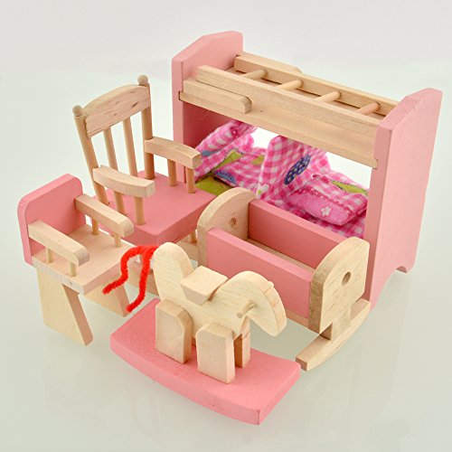 - Feature : Material: Wood; Color: As the picteres show; Orginal Box Size: 19 x 16 x 5.5cm / Nursery room set - bunk beds with beddin & ladder, rocking horse, highchair, rocking chair and crib / For ages: 3+ / Excellent little gift for kids and helping to expand your child's imaginative play and creativity / Promotes fantasy story telling, role playing, and creativity