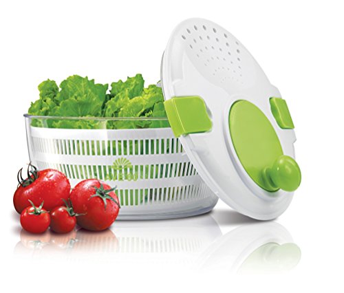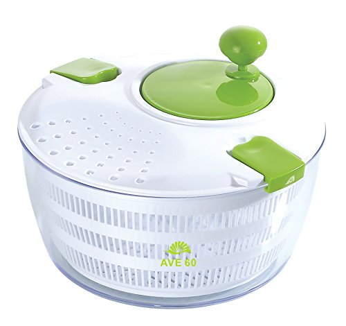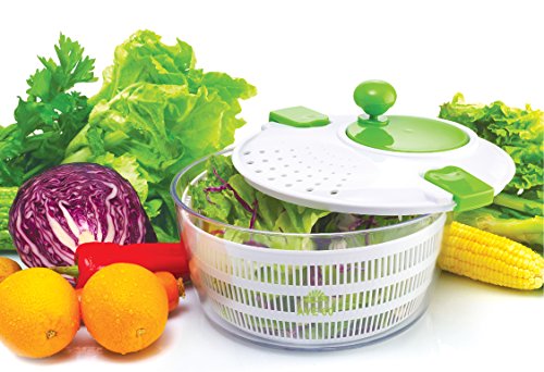 EASY TO USE: Includes a clear outer bowl, a white inner removable strainer basket, a lockable lid, and a spinning mechanism that when initiated causes the inside strainer to rotate rapidly. The water is driven through the slits in the basket into the outer bowl. You can then drain the water without having to open the spinner