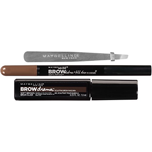 3 piece kit: tweezers, maybelline brow define + fill duo, maybelline brow drama sculpting mascara