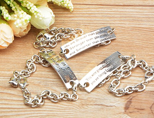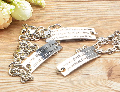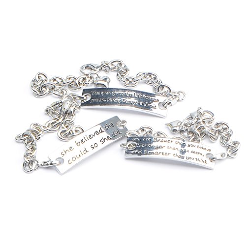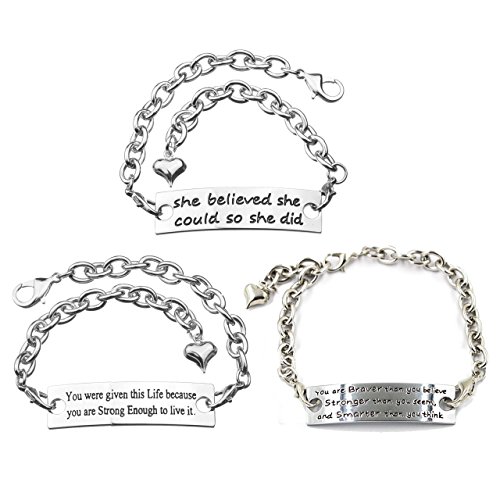 - Material: Stainless steel chain & alloy engraved rectangle signs. 3pcs Unisex Womens Girls Motivational Silver Plated Metal Stainless Steel Bracelets were Included: You were given this Life brcause you are Strong Enough to live it bracelet, You are Braver than you believe, Stronger than you seem, and Smarter than you think Bracelet, She believed she could so she did bracelet for girls, womens.