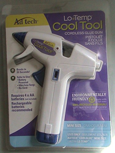 Cool Tool Cordless Glue Gun-White. AD-TECH-Cordless Ultra Low Temp Glue Gun includes finger friendly Cool Glue that bonds in 20 seconds and works better than most liquid glues. Is 75 degrees cooler than most low temp glue guns. Uses 4 AA batteries (not i